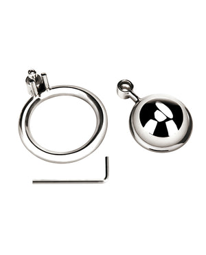 Discover the ultimate chastity experience with this Blue Line cock cage style. Crafted from firm stainless steel, this unique device firmly embraces the wearer's member, leaving no room for movement. The rounded top of the cage evens out the penis head while ensuring breathability and comfortable long-term wear through a strategically placed opening. Its 2-piece design offers effortless assembly and disassembly, granting you versatile control over your chastity play. Hygiene is a breeze with easy-to-clean materials, making this cage ideal for prolonged wear. Whether for daily kink or discreet pleasure, this cock cage lets you explore chastity with confidence and style.