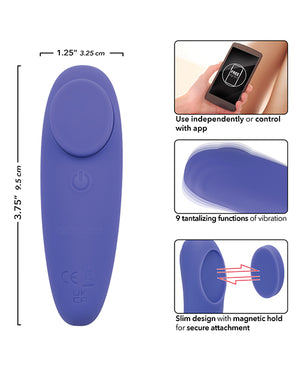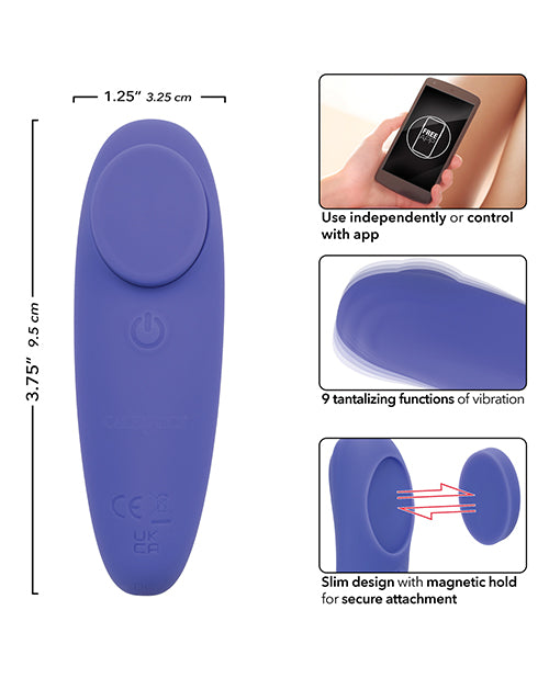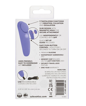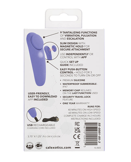Step into a world where discretion meets delight with the CalExotics Connect™ Panty Teaser, a revolutionary device that blends technology with sensuous pleasure. This sleek and slim panty teaser offers an exciting way to enhance your intimate moments, whether you're indulging in solo play or spicing things up with a partner. This panty teaser can be used independently or controlled via a user-friendly, easy-to-download app. This innovative feature allows for an exhilarating level of control and creativity in your play, enabling you and your partner to explore new realms of pleasure from near or afar. The app's intuitive design makes it simple to explore and enjoy the various settings, adding an element of surprise and excitement to your experiences. Its slim design and magnetic hold ensure secure attachment, promising uninterrupted pleasure. Equipped with 9 functions of vibration, pulsation, and escalation, the panty teaser offers a diverse range of sensations to explore. Each function has been carefully crafted to deliver a unique experience, allowing you to tailor your pleasure journey to your current desires. Whether seeking gentle waves of sensation or more intense stimulation, this panty teaser adapts to your needs, enhancing every encounter. It is not only innovative but also easy to use and convenient. Crafted from body-safe Silicone and 100% waterproof with an IPX7 rating, it invites experimentation in various settings, broadening the scope of your pleasure pursuits. The state-of-the-art memory chip resumes on the last function used, and the security travel lock feature, activated by a three-second hold, ensures discretion and easy travel. USB rechargeable and complete with a charging cord, it offers a full charge in 2 hours, with 40 minutes of high-speed enjoyment or 60 minutes on a lower setting. Experience pleasure like never before with the CalExotics Connect™ Panty Teaser, a pathway to new and exciting sensations, providing a deeply satisfying experience. App-enabled.