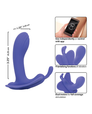 Enter the world of unparalleled delight with the CalExotics Connect Venus Butterfly®, a sophisticated stimulator designed for the modern pleasure seeker. This dual motor stimulator offers full coverage stimulation, perfect for those who desire a comprehensive and deeply satisfying experience. Whether used for solo exploration or as a tantalizing addition to couple's play, it is a versatile and powerful companion.