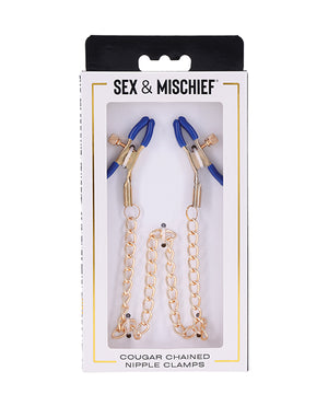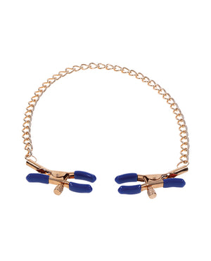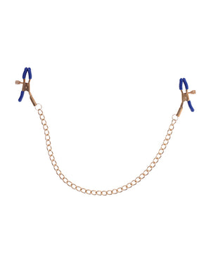 These exquisite clamps feature a gold chain and striking blue plastic tips, blending elegance with a touch of wild playfulness. Perfect for those new to BDSM or seasoned enthusiasts, the adjustable thumb-screws allow you to control the pressure, ensuring a tailored experience. The shimmering gold chain not only adds a sophisticated touch but also offers a tempting opportunity for gentle tugs as passion intensifies. Let your imagination run wild and explore the tantalizing sensations these versatile clamps can bring to various parts of your body.