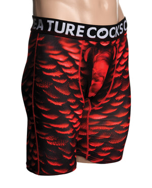 Designed with a bold crimson red scale pattern and a sinful design on the crotch, these boxers instantly highlight your bulge for an unforgettable look.