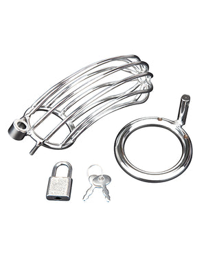 You'll enjoy the firm grip of the stainless steel against your cock as it keeps you in place, no matter how hard you attempt to escape. This Cock Cage keeps your penis in an ergonomically curved enclosure that locks in place with a padlock that secures to a ring that encircles your testicles. Made of metal. Sleek design. Easy to clean. Designed for long-term wear. Includes lock & key.