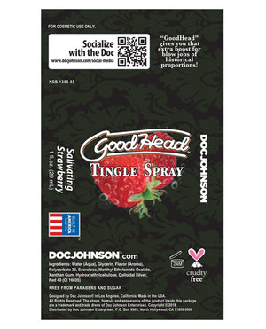 Doc Johnson's(R) original GoodHead collection turned good head into great head, and now the flavors you love are available in convenient lickable sprays formulated to create a cool tingling sensation on contact. A variety of luscious flavors turn your lover's naughty bits into a tasty treat with no sugar or parabens. You won't be able to keep your hands-or mouth-off them! Vegan Friendly. Easy-to-use spray bottle. Proudly made in USA.