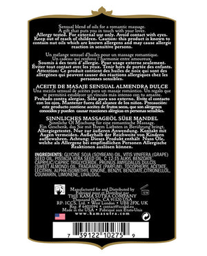 Now available in a convenient 2 fl. oz. travel-size, made with essential oils to promote deep relaxation, this rich, emollient formula makes it a pleasure to give or receive a sensuous, full-body massage. Pour Kama Sutra's Aromatic Massage Oil's into the bath or smooth onto the body as a daily moisturizer for silky, hydrated skin. Made with essential oils and skin nourishing Vitamin E. TSA approved for travel. Allergy tested. Made in the USA. Pleasure Garden: Combines rose, jasmine and sandalwood- a euphoric floral blend designed to promote feelings of joy and release inhibitions. Ingredients: GLYCINE SOJA (SOYBEAN) OIL, VITIS VINIFERA (GRAPE) SEED OIL, PISTACIA VERA SEED OIL, C 12-15 ALKYL BENZOATE, CAPRYLIC/CAPRIC TRIGLYCERIDE, PRUNUS AMYGDALUS DULCIS (SWEET ALMOND) OIL, FRAGRANCE (PARFUM), TOCOPHERYL ACETATE, LECITHIN, AMYL CINNAMAL, BENZYL BENZOATE, CITRONELLOL, GERANIOL, LIMONENE, LINALOOL.