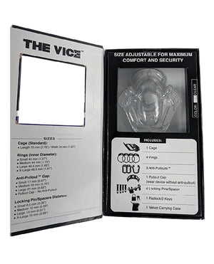 The Vice Chastity Device is the first and only inescapable chastity device in the world not requiring a PA (Prince Albert) piercing. The Vice is commonly compared with the Holy Trainer; however, The Vice rivals even that of the Holy Trainer male chastity belt in both comfort and security! Being the first device we have created, The Vice is our flagship device. It offers a level of security not seen before in other chastity devices. The textured design on the inner tabs of the anti-pullouts are the key to its claim of being inescapable. The longer the device is worn, the more secure it becomes. After 2 days of constant wear, it becomes inescapable! The Vice's anti-pullout system differs from anti-pullouts sold for other devices. This anti-pullout was engineered to work with the device from the start. This differs from aftermarket pieces sold for other chastity devices which can be unbearably uncomfortable. The Vice chastity often goes unnoticed when worn, even while wearing the anti-pullout! It can also be worn without the anti-pullout system which is great for beginners! But when you are ready for the inescapable chastity experience, you will always have the anti-pullouts available to use anytime! The Vice Chastity also includes a handful of different sizes with every device, therefore giving you personalized customization for maximum comfort and security. It's time to enjoy a male chastity belt that offers the true inescapable chastity experience! Cage Length - 70 mm (2.75 inches) Width - 36-> 34 mm (1.4->1.3 inches - Funnel Shape Cage Cage Length - 70 mm (2.75 inches) Width - 36-> 34 mm (1.4->1.3 inches - Funnel Shape Design) Rings: Small - 40 mm,Medium - 44 mm,Large - 46.5 mm,X-Large - 48.5 mm Anti-Pullout Gap- Small - 17 mm,Medium - 19 mm,Large - 21 mm Pullout Cap - Wear the device without any anti-pullout Locking Pin/Spacers (distance of ring from cage) - Small - 6.5 mm,Medium - 10 mm,Large - 13 mm,X-Large - 15 mm Materials: Body safe Polycarbonate One Year Warranty
