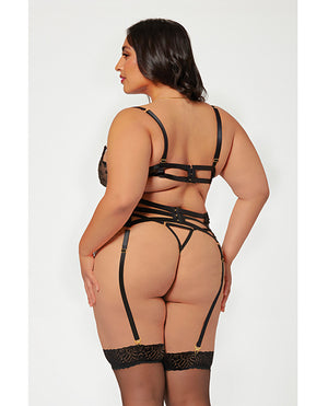 Valentines Heart Embroidered Mesh Bra, Waspie & Panty Black 1x/2x