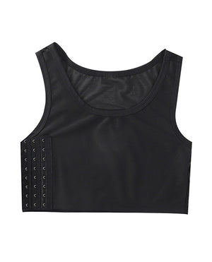 Moderate chest compression with no underwire or padding. Strong mesh provides added support and compression to minimize chest. Adjustable side hook and loop closure for custom fit. Scoop style front and back.