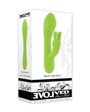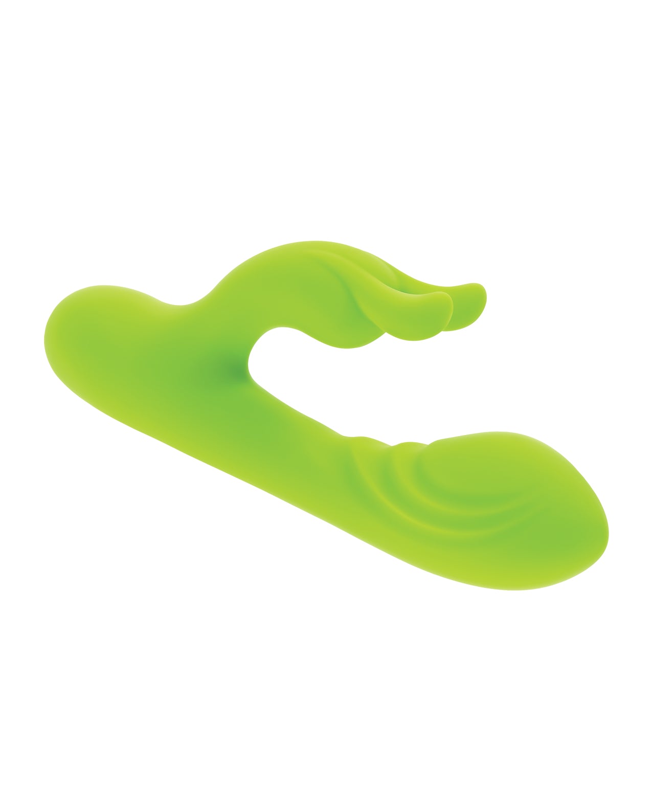 Get nightclub play-time vibes with Brat Bunny, the electric green rabbit vibrator that delivers a steady beat of pure pleasure. Two powerful motors — one in the textured chubby G-spot head and one in the bunny-ear stimulator – work together in unison for a dual experience that’s as gentle or crazy-intense as you desire. Choose the rhythm you want as the toy follows your movements with its flexible, floppy shaft.