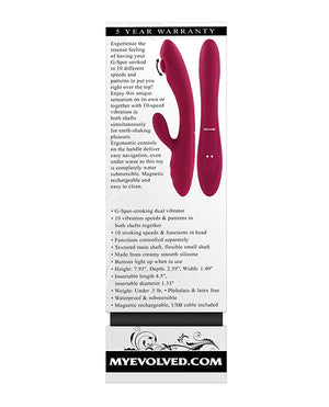 Experience the intense feeling of having your G-Spot stroked in 10 different speeds and patterns to put you right over the top! Enjoy this unique sensation on its own or together with 10-speed vibration in both shafts simultaneously for earth-shaking pleasure. Ergonomic controls on the handle deliver easy navigation, even under water as this toy is completely water submersible. Magnetic rechargeable and easy to clean. Five Year Warranty.