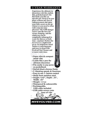Experience the ultimate in discretion with this stylish, thin, polished metal vibe that looks just like an upscale pen. Keep it in your purse without any fear of embarrassment and enjoy your little secret on the go whenever you need to relax with some me-time pleasure! The USB charger screws into the base for secure charging, and the whole toy can be completely submerged in water for shower or bath time - anytime! Perfect for travel or as a nightstand go-to, its nonporous metal surface is extra hygienic and easy to clean with Evolved Toy Cleaner and a warm water rinse.