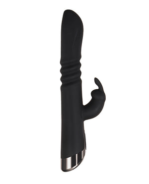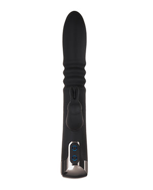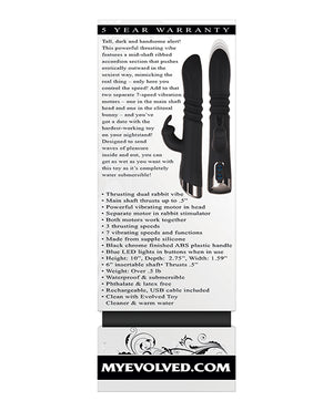 Tall, Dark and Handsome Alert! This powerful thrusting vibe features a mid-shaft ribbed accordian section that pushes erotically outward in the sexiest way, mimicking the real thing - only here you control the speed. Add to that 2 separate 7-speed vibration motors- one in the main shaft head and one in the clitoral bunny - and you've got a date with the hardest-working toy on your nightstand! Designed to send waves of pleasure inside and out, you can get as wet as you want with this toy as it's completely submersible. Thrusting dual rabbit vibe. Main Shaft thrusts up to .5 inch. Powerful vibrating motor in head Separate motor in rabbit stimulator. Both motors work together. Blue LED lights in buttons when in use. Phthalate and latex free 3 thrusting speeds. 7 vibrating speeds and functions USB rechargeable. Waterproof submersible Material: Silicone. Black chrome finished ABS plastic handle. Dimensions: Overall Length - 10 inches Insertable Length - 6 inches Width - 1.59 Five Year Warranty.
