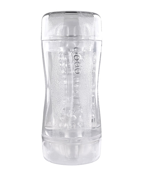 Allow the pleasure possibilities to unfold with this unique dual-ended stroker that's beautifully transparent for an erotic see-through experience. Two separate entries with varying sizes (one tight, one loose) lets you choose your adventure inside the circular beaded chamber that's soft and squishy, yielding yet firm. An included vibrating ring lets you experiment with intense stimulation while you play! The hard plastic exterior canister is textured for an easy grip while caps at both ends ensure safe storage and protection. Sleeve pops out for cleaning.