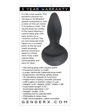 It's hip to be square! This powerful silicone toy vibrates in 10 different speeds and patterns with a state-of-the-art motor in its bulbous shaft. The square base sits solidly in the hand offering a comfortable grip with easy access to a 1-button control. The six-inch textured shaft tapers to a rounded point at the tip and swells gradually before cinching in again to a thick stem. Fully water submersible, rechargeable and easy to clean.