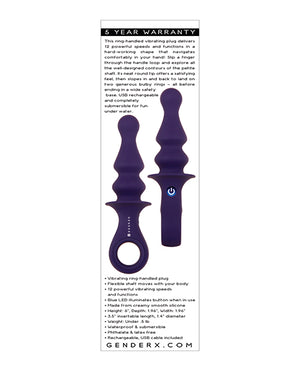 This ring-handled vibrating plug delivers 12 powerful speeds and functions in a hard-working shape that navigates comfortably in your hand! Slip a finger through the handle loop and explore all the well-designed contours of the petite shaft. Its neat round tip offers a satisfying feel, then slopes in and back to land on two generous bulby rings - all before ending in a wide safety base. USB rechargeable and completely submersible for fun under water.