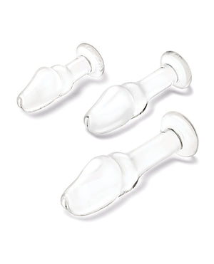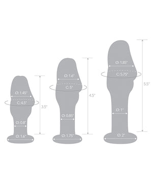 Embark on a journey of tailored pleasure with the 3-Piece Helmet Head Glass Butt Plug Set. Designed for versatility, each plug features a stimulating helmet shape that promises a stimulating experience. The set includes three graduated sizes – 4, 5, and 6 – catering to every level of exploration. Crafted from body-safe and hypoallergenic glass, the seamless design is easy to clean and can be used with all lubricants. Explore temperature play by heating or cooling the plugs for a thrilling sensory adventure. Each plug features a flared base, for safety during use. Elevate your pleasure journey with this carefully designed set of plugs ranging from small to large to work your way up to the grandest pleasure.