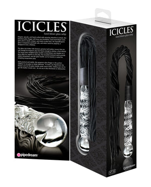Elegant, upscale, and hand-crafted with amazing attention to detail, this luxurious glass flogger No.38 will leave you breathless. Each hand-blown Icicle glass piece is sleek, unique, and made to play hard. The hypoallergenic glass is nonporous and body safe, and when cared for properly, is designed to last a lifetime.