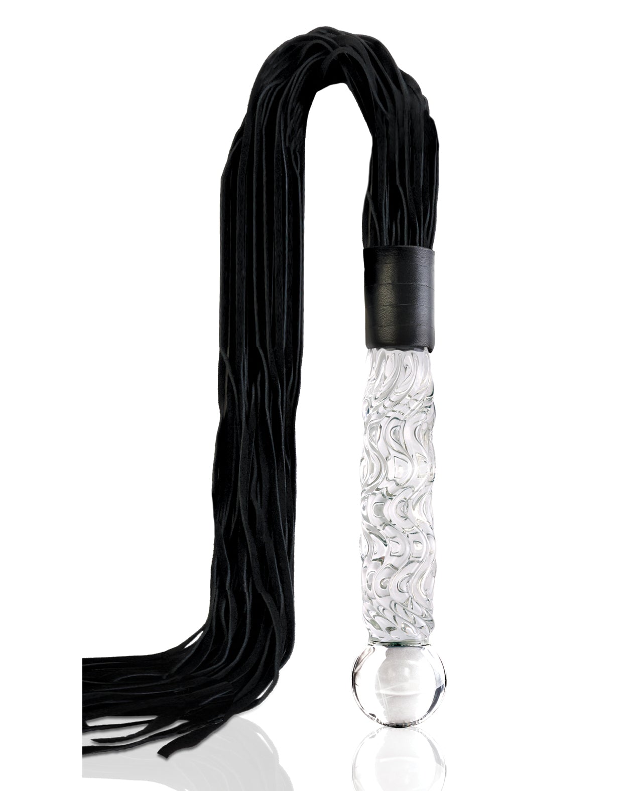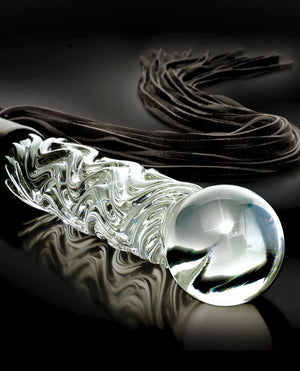 The glass Cat-O-Nine Tails features genuine bull leather tresses that are soft enough for beginner play but heavy enough to deliver a firm whack! The heavy-duty weighted glass handle is hand-blown and doubles as a glass dildo for vaginal or anal play. The beautiful textured swirls provide added stimulation, and the glass handle can be heated or cooled for tempting temperature play. Both practical and stylish, this gorgeous glass flogger is the perfect addition to any glass or fetish collection.