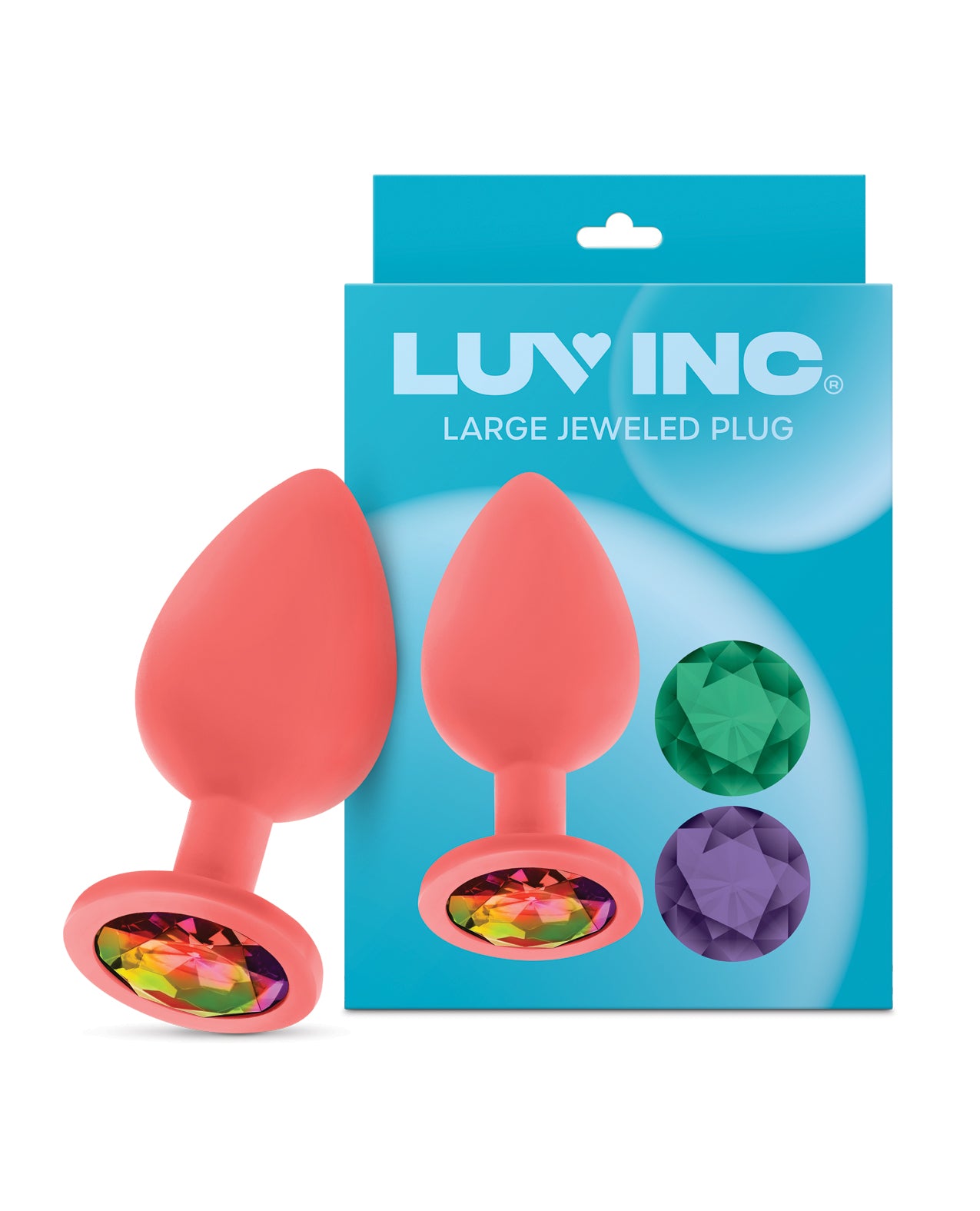 Luv Inc. In the business of Love. A silicone butt plug with exchangeable jewels for your different moods. Great for beginners and experienced users. 100% silicone. 3 stones to choose from. Height: 3.7″ Diameter: 1.6″