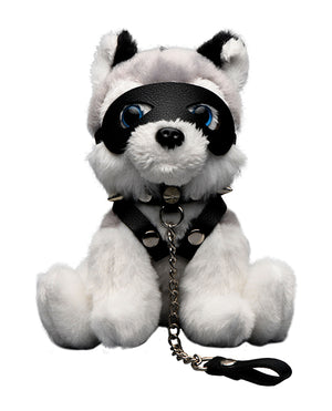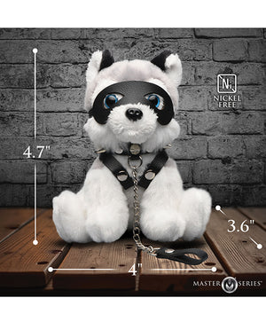 Featuring a vegan leather mask, a spiked collar, and a detailed body harness with a chain leash, this pup is the epitome of edgy fun.