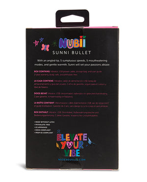 Meet the Sunni bullet and transform your passions into a blissful horizon of satisfaction. The Nubii Sunni Bullet is a casual entry into sensation play. By focusing on the senses, including touch, with an emphasis on warmth, Sunni helps you get more enjoyment from sex. With an angled tip, this bullet will bathe you in waves of ecstasy with five sumptuous speeds and five mouthwatering modes, illuminating your senses with delight. Expand your sexual world by engaging the warming function and set your desires ablaze. At an affordable price, you can embrace the sunny side of self-pleasure and brighten your most seductive moments. Two Year Warranty.
