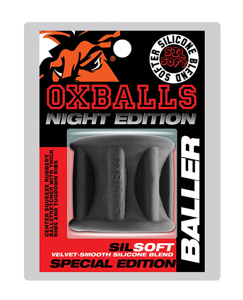 OXBALLS BALLER rib-stretch NIGHT EDITION max-tall ballstretcher in our lush rubbery SILSOFT SILICONE blend and a smooth, velvet-black color. This is a softer, squishier formula for the hardest and darkest of play.