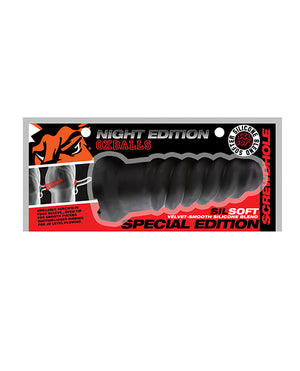 OXBALLS new hole-shagger SCREWDHOLE (it fills a hole turning it into a rubbery tighter fuck-pucker) in amazing squishy-soft NIGHT EDITION silicone-blend SILSOFT SILICONE mix, in deep dull velvet-black color—a soft fuck-tube plug designed for the hardest, darkest-night play.