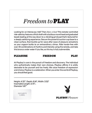 Looking for an intense joy ride? Then Have A Seat! This remote-controlled ride-able toy features a thick shaft with a bulbous round head and graduated beads leading all the way down to a vibrating grind pad that's textured for a deeply satisfying experience. Secure the powerful suction cup base to a clean surface, then buckle up for wave after wave of pleasure sensations as your orgasm builds to an extraordinary climax. Ride hands-free with over 45 combinations of rhythms and intensity using the remote, and take this bronco under water if you like, as this toy is fully submersible.