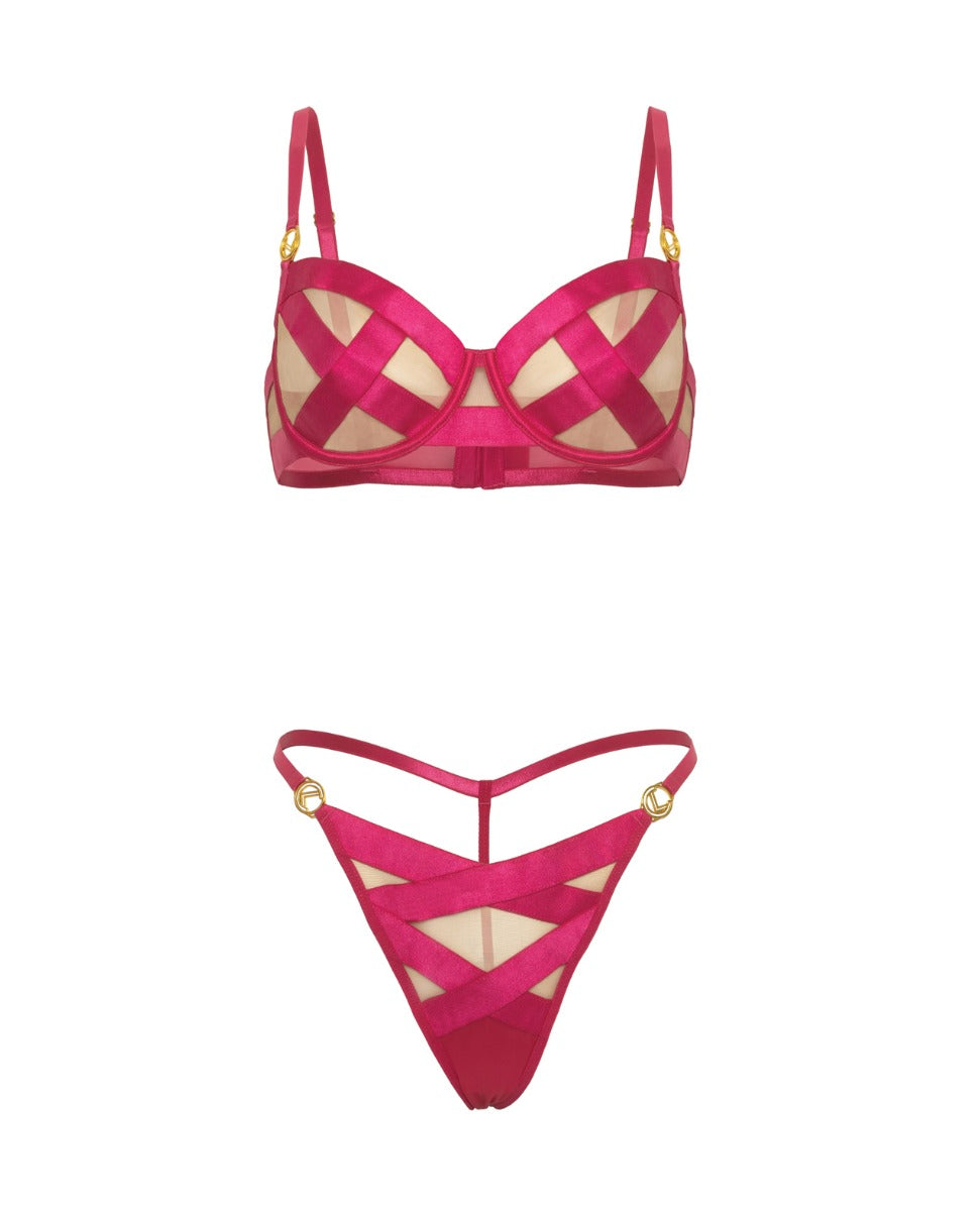 Raelynn Satin Strappy Underwire Bra w/G-String 2 pc Set - Pink Yarrow SM