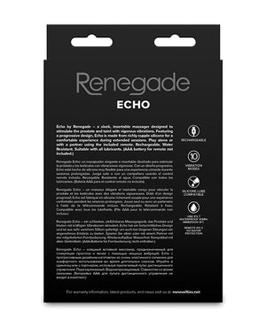 Echo by Renegade – a sleek, insertable massager designed to stimulate the prostate and taint with vigorous vibrations. Featuring a progressive design, Echo is made from richly supple silicone for a comfortable experience during extended sessions.