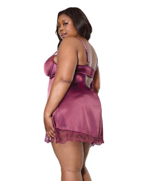 Scallop Lace Trimmed Stretch Satin Chemise w/Underwire Cups - Mauve Plum 1X/2X