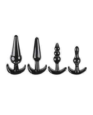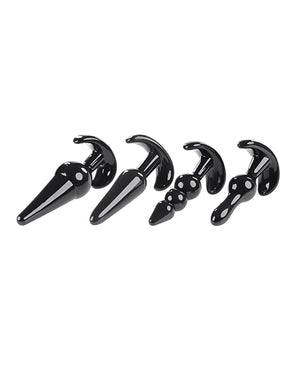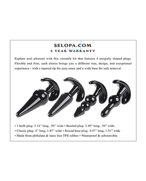 Explore anal pleasure with this versatile kit that features 4 uniquely shaped plugs. Flexible and firm, each choice brings you a different size, design, and exceptional experience - with a tapered tip for easy entry and a wide base for safe removal.