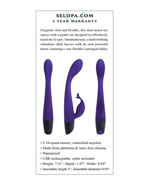 Elegantly slim and flexible, this dual motor toy curves with a gentle arc designed to effortlessly reach the G-spot. Simultaneously, a hard-working stimulator shaft buzzes with its own powerful motor, featuring a very flexible 2-pronged tickler. Five Year Warranty.