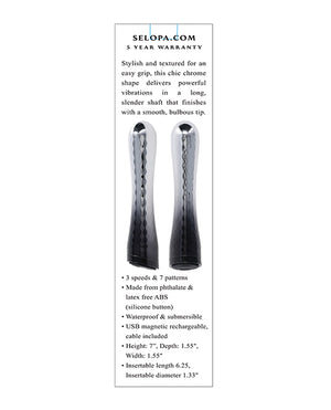 Stylish and textured for an easy grip, this chic chrome shape delivers powerful vibrations in a long, slender shaft that finishes with a smooth, bulbous tip.