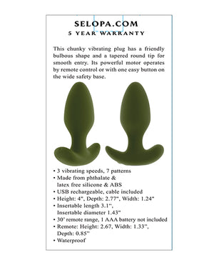 This chunky vibrating plug has a friendly bulbous shape and a tapered round tip for smooth entry. Its powerful motor operates by remote control or with one easy button on the wide safety base.