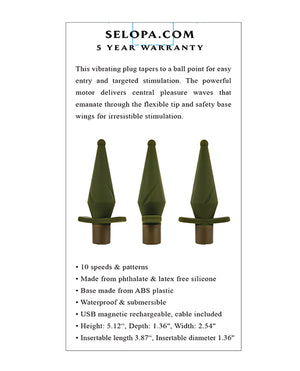 This vibrating plug tapers to a ball point for easy entry and targeted stimulation. The powerful motor delivers central pleasure waves that emanate through the flexible tip and safety base wings for irresistible stimulation. Five Year Warranty.