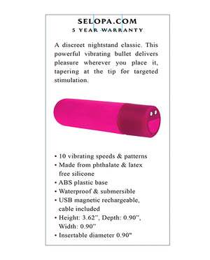 A discreet nightstand classic. This powerful vibrating bullet delivers pleasure wherever you place it, tapering at the tip for targeted stimulation. Five Year Warranty.