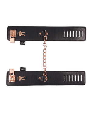 Give your brattiest partner a reason to reconsider their actions with the Brat Locking Cuffs! Crafted with sleek black vegan leather and adorned with captivating rose gold accents, lock your plaything right where you want them and enact every enticing punishment they deserve. Versatile to your level of play, keep the cuffs locked together with the included chain or on their own with the accompanying lock and key. Use their tricks against them through teasing and defiance as they beg for release and teach them a lesson in obedience.