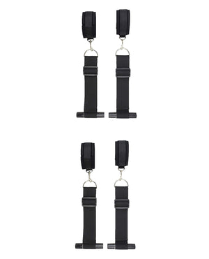 Easily attach to any door to enjoy some bondage fun. Just place the 2 acrylic tubes over the top of any open door, place the other 2 under the bottom, close (and lock for safety) the door. Bind your partner and enjoy. Comes with 4 adjustable tethers, 2 velvet wrist and 2 ankle cuffs, 4 acrylic door jam tubes and a satin eye mask.