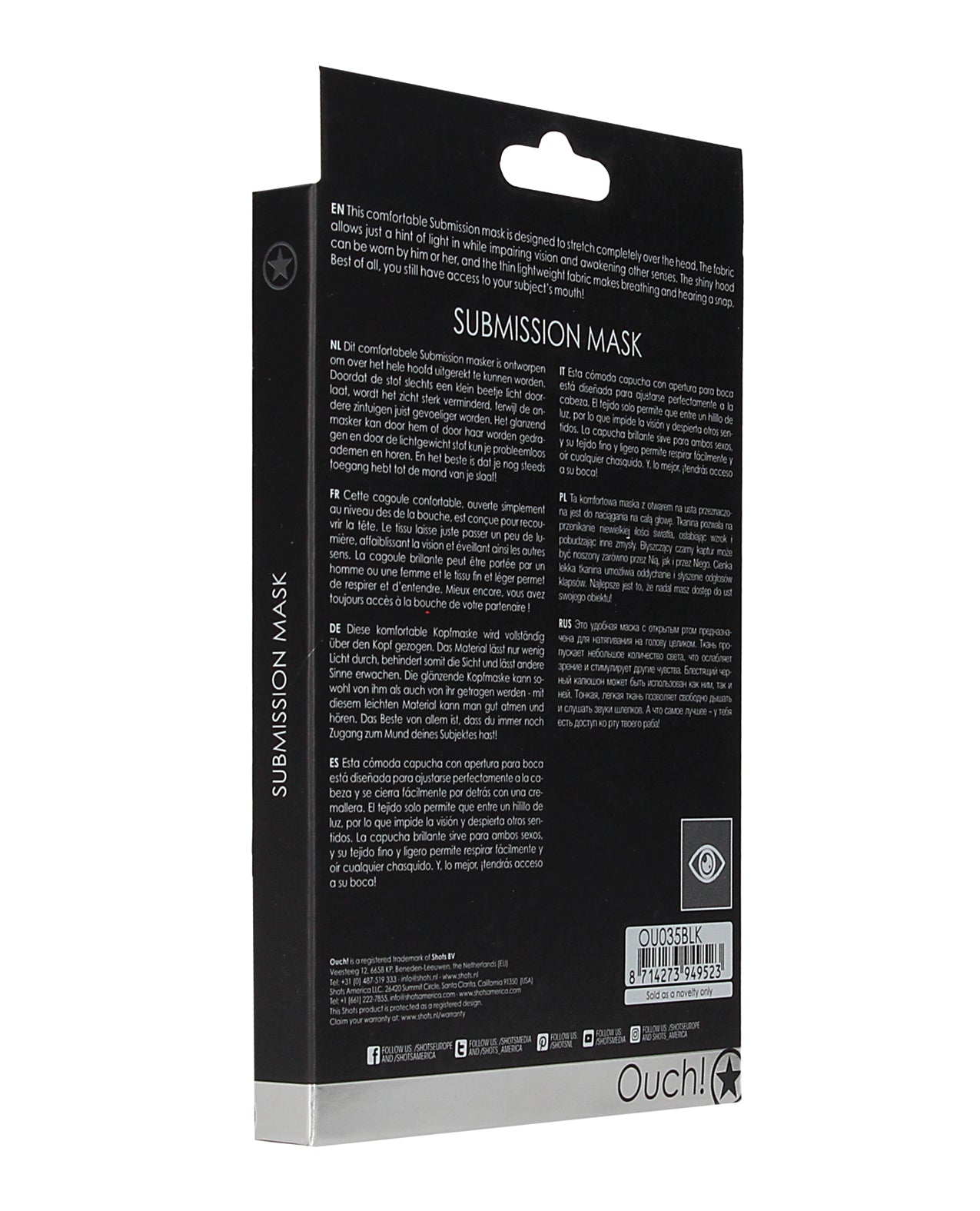 This comfortable Submission mask is designed to stretch completely over the head and closes easily at the back with a zipper. The fabric allows just a hint of light in while impairing vision and awakening other senses. The hood can be worn by him or her and the thing lightweight fabric makes breathing and hearing a snap. Best of all, you still have access to your subjects mouth!