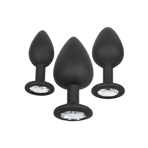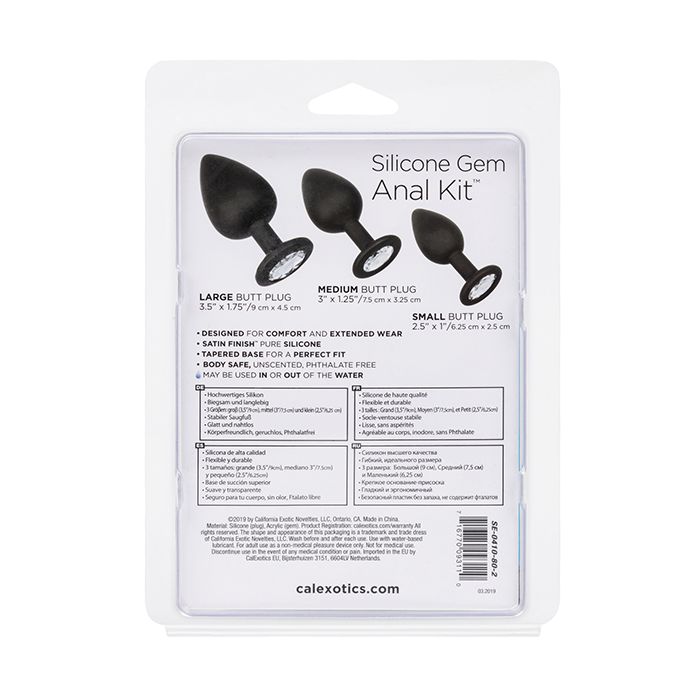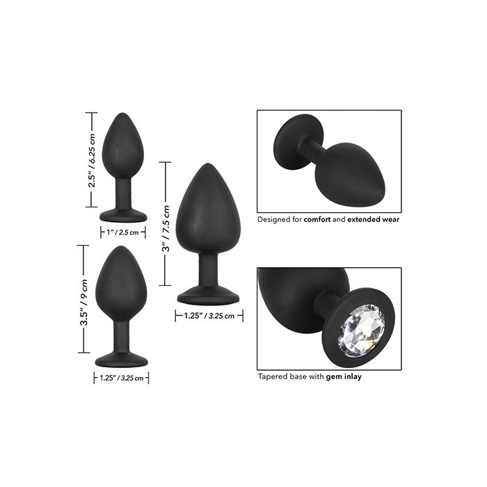 Open the door of thrilling anal sensation with the Silicone Gem Anal Exerciser Kit™. This glamorous kit includes a set of 3 graduated anal plugs with a gem base to let you safely and comfortably increase passionate anal stimulation. To enjoy everything the exhilarating world of anal play has to offer, training is in order to ensure total safety and satisfaction. Each probe in our kit gradually increases in length and girth for superb pleasure at any level of pleasure play.