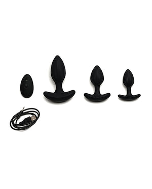 Take your training to the next level with MotoVibe's Plug N Play set. Included in this kit are two non-vibrating plugs and one remote controlled vibrating plug, each bigger than the one before it. With 10 different vibration modes, the water resistant rechargable plug will keep you entertained all night long.