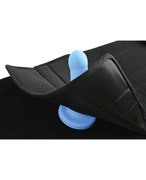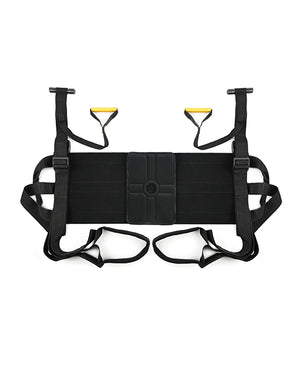 You won't believe what you can do behind closed doors! This Special Edition of our classic Door Jam Sex Sling includes a detachable Dildo and Bullet Anchor Pad, padded seat and foot supports for extra comfort. This luxe swing offers multiple sexual positioning options for standing, sitting and tilting, making it versatile for everyone. To use, simply place the small metal bars of the strap over the top of your solid door, securely close the door and position the fully adjustable straps any way you want them. To bring your play to another level, incorporate the detachable anchor pad with your favorite flare based dildo (not included) and up to four bullet vibes (not included). Supports up to 325 pounds. Features: Detachable Dildo and Bullet Anchor Pad with 2" fixed O-Ring and four pockets for bullet vibes. Padded seat 32" wide by 12" high. Padded foot supports. Handles with a golden finish. Limited Lifetime Warranty. Special Edition Door Swing fits over solid door. Supports weight up to 325 pounds. Allows multiple positions for partners, including "weightless sex." Sling length is adjustable in the seat and foot supports. Includes: 32" wide x 12" high Padded Seat. Padded Foot Supports. Golden Hand Grips. Dildo & Bullet Anchor Pad.