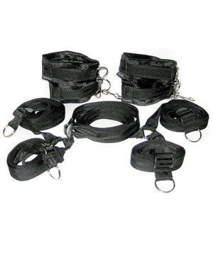 4 adjustable cuffs (fits 4-12" wrists), four restraint straps secured to one connector strap that fits securely under your mattress