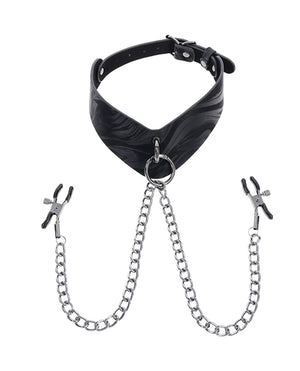 Elevate your scenes with the elegant dominance of the Velvet Noir Collar with Nipple Clamps. Crafted from smooth faux leather with a sleek marbled finish, this angled collar commands attention and control. Hematite-plated hardware, including a removable ring, offers both sophistication and functionality. A single metal chain connects to adjustable nipple clamps, adding a teasing element that can be removed for even more versatility. Use the collar with the clamps, swap in a leash, or wear it solo as a stylish day collar. Designed for both comfort and exploration, this piece invites you to play with power on your terms.