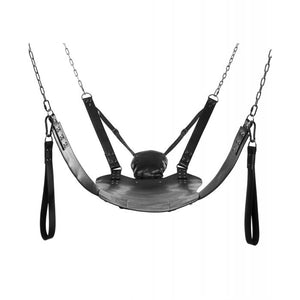 This exquisite bondage sling allows you to access your partner while they are suspended in the air, spread open and waiting for you. The leather material is heavy, while retaining a price point that is accessible for more bondage enthusiasts! The sling allows them to lie back and place their feet in the included stirrups. The padded pillow will cradle their head, with adjustable straps at the head that allows you to raise or lower their upper bodies. The stirrups are detachable with strong metal carabineers, and the advanced material reduces some of the weight for easier transport. Measurements: 38 inches in length, 21 inches in width. Material: Leather, Metal. Color: Black. Note: Chains sold separately. Max weight is 300 lbs.
