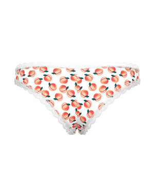 Venture through an orchard of temptation with our Sweet Treats Crotchless Boy Short with Lube. These silky microfiber panties are like satin petals on a sensual flower. Graced with the succulent allure of fruit prints and delicate lace trim, they beckon customers like a siren's song. And, with a split crotch, they're a secret garden waiting to be explored. Available in three prints: strawberry, blueberry, and peach, each pair comes with two (3ml) Wicked Sensual Care edible lube packettes flavored to match the fruit on the panty, like dewdrops on ripe fruit, ensuring an intoxicatingly smooth journey into ecstasy.