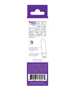 BAM MINI rechargeable bullet packs one powerful punch with 10 supercharged vibration modes. Sleek and sexy, this pint sized mini is extremely powerful, delivering intense mind blowing pleasure. Whisper quiet and completely submersible, this discrete mini vibrator is a must have for all. Rechargeable- USB cable included. Charge time 30 minutes. Run time: 1 hour .Dimensions: Height: 9.6cm and max diameter: 2cm.• 100% Silicone