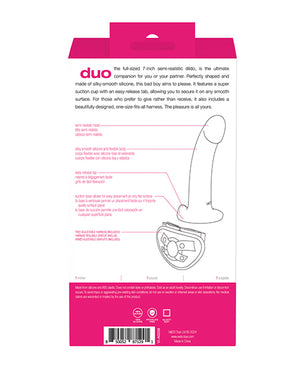 Duo the full-sized 7" semi-realistic dildo, is the ultimate companion for you or your partner. Perfectly shaped and made of silky-smooth silicone, this bad boy aims to please. It features a super suction cup with an easy-release tab, allowing you to secure it on any smooth surface. For those who prefer to give rather than receive, it also includes a beautifully designed, one-size-fits-all harness. The pleasure is all yours.