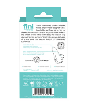 Fini Rechargeable Bullet Vibe boast 10 extremely powerful vibration modes. Ergonomically designed with a finger holder and finger rest to help you pinpoint your clitoris and all other erogenous zones. Made of silky smooth silicone with a flexible body, this bullet will keep you wanting more and more. Take it in the shower, bath, pool or to any water play you can imagine, it's completely submersible. Nub for clitoral stimulation Stretchy silicone to fit any finger 10 vibration modes Water submersible Travel lock .features 100% silicone. Phthalate free. Velvety soft .MEASUREMENTS: 1.75"" x 3.5"" (4.44 cm x 8.89 cm)