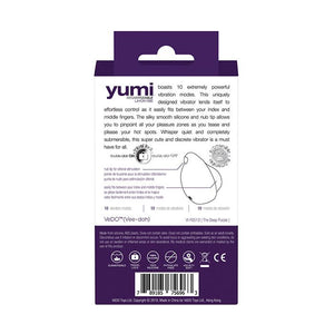 YUMI boasts 10 extremely powerful vibration modes. This uniquely designed vibrator lends itself to effortless control as it easily fits between your index and middle fingers. The silky smooth silicone and nub tip allows you to pinpoint all pleasure zones as you tease and please hot spots. Whisper quiet and completely submersible this super cute and discrete vibrator is a must have for all. Travel Lock. Waterproof. M USB rechargeable, cable included. • 100% Silicone